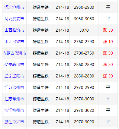 7月30日华北地区铸造 生铁价格个别上调,武安3050-3080元/吨,临汾3070元/吨。