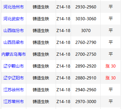 8月19日华北地区铸造 生铁价格稳,武安3030-3060元/吨,临汾3070元/吨。