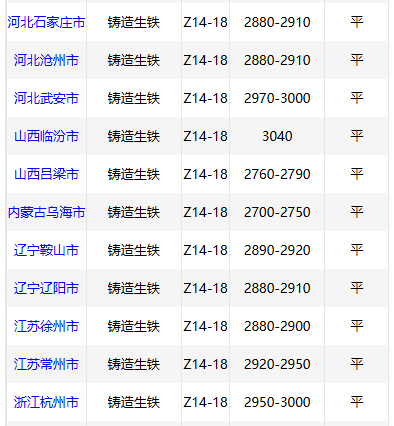 9月5日华北地区铸造 生铁价格稳,武安2970-3000元/吨,临汾3040元/吨。