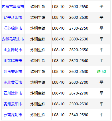 9月10日华南地区炼钢 生铁价格稳,广东地区L8-L10报2600元/吨,现款含税。