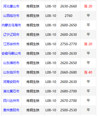 9月15日华北地区炼钢 生铁报价个别调整,唐山2660元/吨。