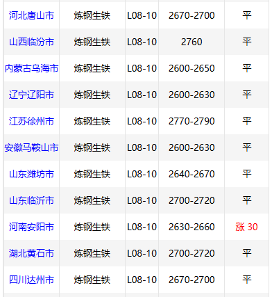 9月17日华北地区炼钢 生铁报价部分调整,唐山2700元/吨。
