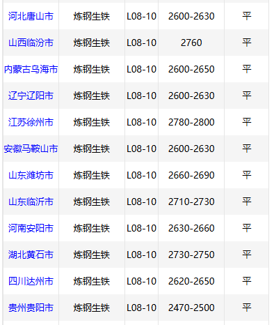 9月30日华北地区炼钢 生铁报价稳,唐山2620元/吨。