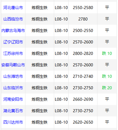 11月10日华北地区炼钢 生铁报价稳,唐山2580元/吨。