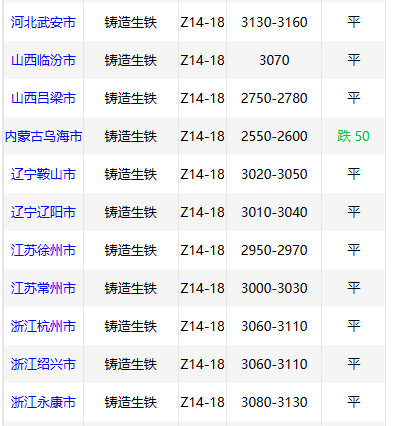 11月13日华南铸造 生铁价格稳,Z18广西2970,高州3010,阳江3010,现金含税。(单位:元/吨)