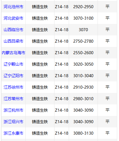 12月2日华北地区铸造 生铁价格稳,武安3070-3100元/吨,临汾3070元/吨。