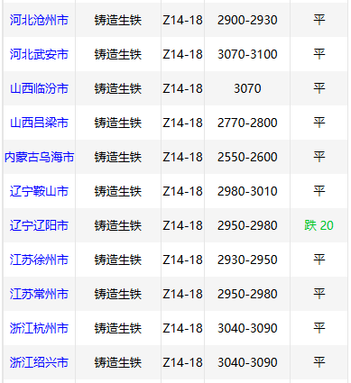 12月23日华北地区铸造 生铁价格稳,武安3070-3100元/吨,临汾3070元/吨。