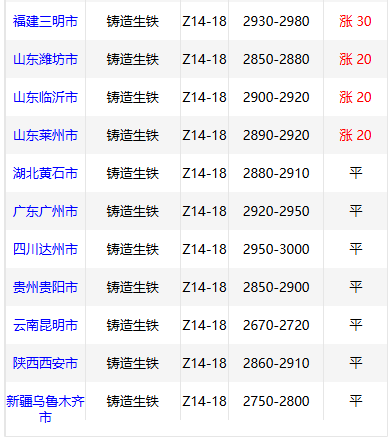 1月8日华南铸造 生铁价格涨20,Z18广西2960,高州3000,阳江3000,现金含税。(单位:元/吨)