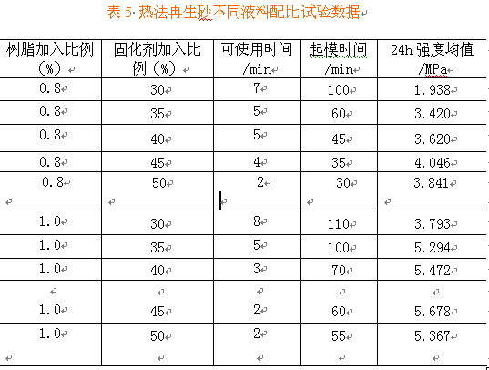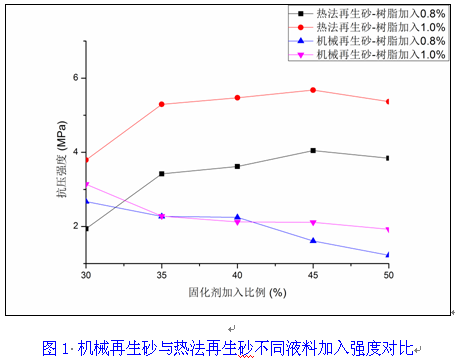 (1)机械再生砂最佳液料加入为树脂1.0%(占砂重),固化剂30%(占树脂);热法再生砂最佳液料加入为树脂1.0%(占砂重),固化剂45%(占树脂)。