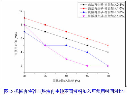 根据图2可以看出,固化剂加入量控制在30%~50%,随着固化剂的增加,热法再生砂和机械再生砂的可使用时间都逐渐减少,最大可使用时间固化剂加入量在30%。