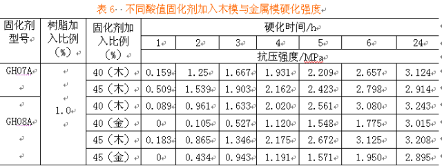 (2)其余条件不变,单纯提高固化剂总酸度值并不能显著缩短铸型起模时间。可以从提高模型温度、冷铁及工装温度,来加速内部反应,加速硬化。