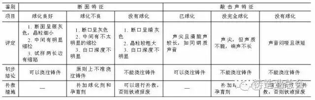 球处理完毕后,用样勺浇注一块厚10mm左右的试块,冷却至暗红色,淬火击断后,如发现试块上表面有一道黑边,则表示球化不良,且黑边越厚,球化越差,产生衰退,此时如铁液温度高可补加合金。从试块上还可看出:如试块周围成圆弧状,并中间凹陷,有的还有一道道皱纹,则也表示球化良好;如试块上表面有麦皮状的点,则表示铁液氧化,易于衰退。在这种情况下,应对炉子进行改造。