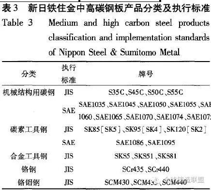新日铁住金中高碳热轧带钢执行JIS , SAE和新日铁住金3种产品标准,产品包括机械结构用碳钢、工具钢、铬钢、铬钥钢以及硼钢等,以黑皮、酸洗和喷丸处理3种状态交货。新日铁中高碳钢板产品分类及执行标准如表3所示。