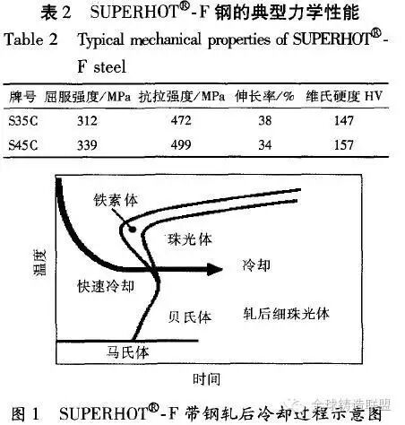 表1中S35 C和S45 C钢是JFE开发的具有优良厚度精度和表面质量的热轧高碳汽车钢SUPERHOT- F系列,这种高碳钢板不仅具有优良的冷加工成形性,而且热处理后具有合理的硬度,适用于汽车驱动部件,尤其是自动变速器回转体部分的板金一体化成形。JFE为保证高碳钢具有优良的加工性能,严格控制带钢的冷却过程和球化退火温度。SUPERHOT-F钢的典型力学性能如表2所示,图1为SUPERHOT一F带钢轧后冷却过程示意图。