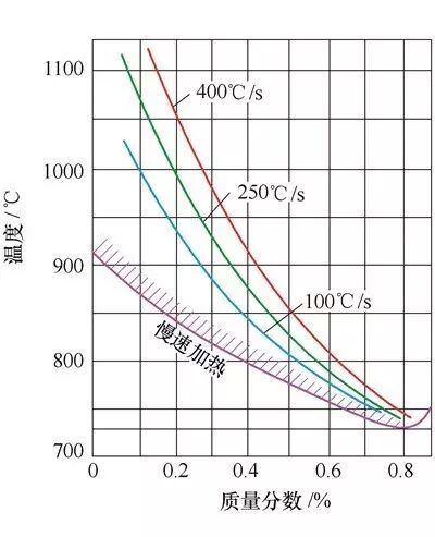 快速加热时,Ac3点也随着加热温度的升高而升高,图2示出了亚共析钢在不同的加热速度下得到完全淬火所需的温度。