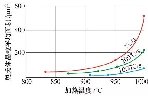 在加热速度较低的范围内,随着加热速度的增大,刚完成奥氏体化所形成的奥氏体起始晶粒显著减小,但在加热速度很高时,奥氏体起始晶粒几乎不再随加热速度的增加而减小。实践证明,在感应加热的实际条件下,加热速度极高,所得的起始晶粒极为细小,并且与加热速度无关。但是,已形成的奥氏体晶粒的长大却与加热速度有关。当继续加热到某一温度时,加热速度越小,所形成的实际奥氏体晶粒越大,如图3所示[2],所以只要加热温度与加热时间控制得当,感应加热是不会产生过热的。