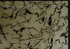 1)在100倍的显微照片上,粗大的石墨片上附着许多刺状小石墨片,即为魏氏石墨。