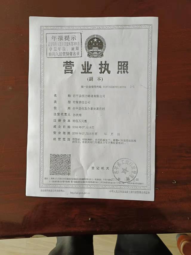 茌平县恒力铸造有限公司成立于2008年07月18日,注册地位于茌平县信发办事处葛庄村,法定代表人为孙秋梅。经营范围包括铝型材、钢铁铸件、农用机械加工、销售。