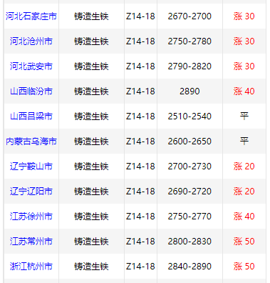 7月11日华北地区铸造 生铁价格涨40,武安2790-2820元/吨,临汾2890元/吨。