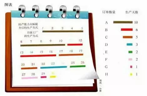 如果能够通过转产改善提高了转产能力,将会达到图表2中的第二种生产状态。我们以一天的产量为一个最小单位排产,也就是一天转产一次,可以带来什么样的效果?